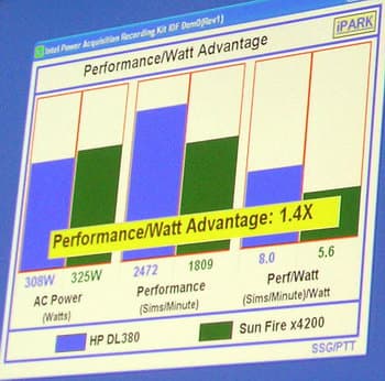 На задаче, связанной с моделированием в реальном времени финансовых прогнозов (по методу Монте-Карло, программа SunGard Adaptiv Credit Risk), разумеется, победил Woodcrest, причем с полуторакратным преимуществом (24,2 секунды против 34,7 с у AMD-системы). И с преимуществом по Performance на ватт в 1,4 раза.