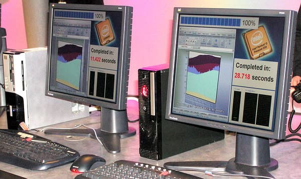 Забавность в этих «публичных гонках» заключается даже не в том, что Intel впервые (!) стала на людях сравнивать результаты для своих процессоров с процессорами AMD, а в примерно годичной разнице в возрасте между этими системами. Посмотрим, «сделает» ли Woodcrest новеньких Оптеронов через полгода. ;)