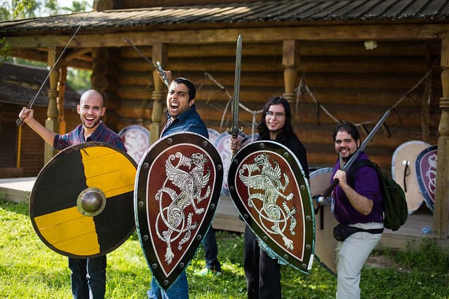 На второй день вечером участников повезли в, как это модно говорить, этно-комплекс «Шуваловка» — небольшой парк развлечений, декорированный под русскую деревню. Развлечений там было действительно много, включая кидание валенками, стрельбу из луков, перетягивание канатов… там же был и живой медведь!