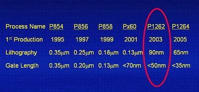 По заявлению представителей компании, Intel намерена начать массовое производство чипов с использованием 45 нм элементов в 2007 году. В настоящее время Intel производит чипы с использованием техпроцессов P860/1260, работающих с узлами порядка 0,13 мкм (P860 — работа с 8-дюймовыми, то есть, 200 мм пластинами, 1260 — с 12-дюймовыми). Для критических участков используются 248 нм литографические инструменты от Nikon. В 2003 году Intel намерена перейти на техпроцесс P1262, то есть, 0,090 мкм нормы, где будут задействованы 193 нм и 248 нм сканнеры. Затем, примерно в 2005 году, Intel планирует приступить к выпуску чипов по техпроцессу P1264 с 0,65 мкм нормами и 157 нм сканнерами.