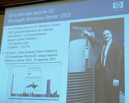 В качестве доказательства лидирующей роли Hewlett-Packard в продвижении систем на процессорах Itanium 2 Хилмар привел такой пример: 64-битная версия Windows Server 2003 разрабатывалась именно на 64-процессорном сервере Superdome. И даже показал фото довольного Стива Балмера на фоне этого сервера: