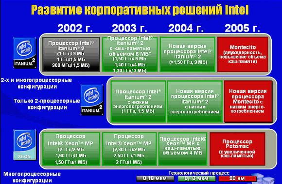 Почему именно сейчас ожидаются такие серьезные перемены? Во-первых, процессоры семейства Itanium, образно выражаясь, прошли свой «нулевой цикл» от ядра Merced. Теперь это надежные чипы с объмом кэша L3 до 6 МБ, изготавливаемые по наиболее современному техпроцессу, 0,13 мкм, благодаря чему удалось не только поднять тактовые частоты, но также существенно снизить энергопотребление систем.