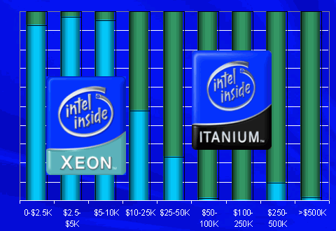 Во-вторых (и это — утверждение, с которым не поспоришь) стоимость новых систем весьма болезненно ударит по производителям присутствующих на рынке RISC-решений, поскольку конкурировать с Intel там, где она берется наладить выпуск массовых продуктов, сравнивмых по производительности, достаточно сложно.
