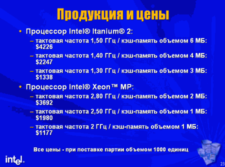Собственно говоря, к чему была подведена аудитория: с выпуском нового Itanium 2, плюс, благодаря наличию широкого спектра решений на процессорах Xeon, компания Intel получила возможность серьезным образом перекроить нынешнюю рыночную ситуацию в пользу решений на базе своей процессорной архитектуры, теперь — и в секторе высокопроизводительных многопроцессорных систем.