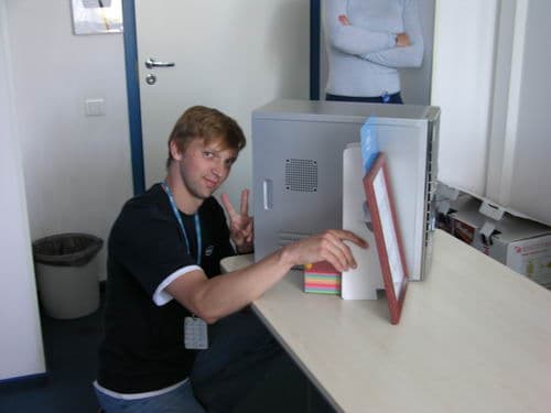 P.S. Красивая фотография компьютера, которая размещена в начале статьи, давалась с трудом: композиция всё время нарушалась неустойчивыми конструкциями из диплома и вымпела Intel. Вот как это выглядело в итоге на самом деле :-)