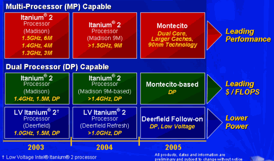 Что касается второй новинки — 1,0 ГГц LV (Low Voltage) процессора Intel Itanium 2 с 1,5 МБ кэша L3, то именно этот чип до сих пор фигурировал лишь под рабочим названием Deerfield. Новый чип выполнен на базе того же ядра Madison и в какой то степени является его вариантом со сниженной тактовой частотой.