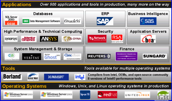 Известно, что чипы Itanium 2 с ядром Madison обладают кэшем L3 объемом до 6 МБ, производятся на современных линиях с соблюдением норм 0,13 мкм техпроцесса и обладают достаточно высокими тактовыми частотами в сочетании с оптимизированным энергопотреблением. Завершить картину готовности семейства чипов Itanium 2 к широкому индустриальному внедрению можно упоминанием о полной программной вооруженности проекта: прошли времена, когда пакеты под IA64 можно было пересчитать по пальцам, сейчас потенциальный пользователь имеет возможность выбора из нескольких отлаженных и оптимизированных операционных систем, баз данных, более чем 450 специализированных приложений.
