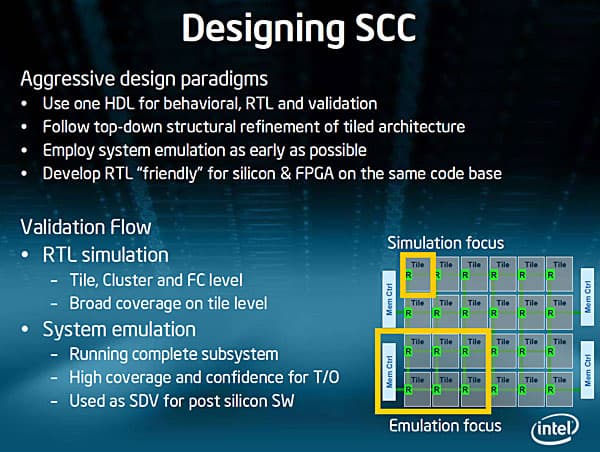 SCC разделен на шесть блоков по восемь ядер, каждый из которых имеет отдельную линию электропитания. При этом каждая пара ядер может иметь индивидуальную тактовую частоту. SCC построен по принципу тайловой архитектуры (tile-based), т. е. из блоков, что обеспечивает гибкость как в смысле сокращения блоков, так и их наращивания для масштабирования вычислительных возможностей.