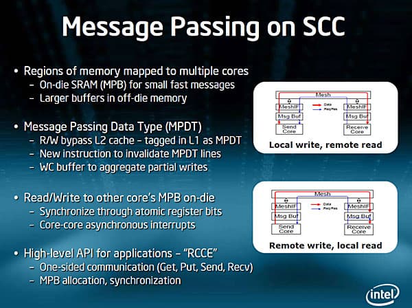 Каждое ядро SCC может читать буфер с сообщениями (message buffer), а управляющее программное обеспечение может проверять корректность содержимого буфера. Буфер сообщений образуется из L1-кэша каждого ядра.