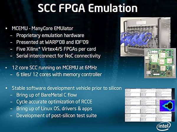 На фото выше можно посмотреть на структуру SCC и тестовую систему с реальным 48-ядерным чипом. Есть вариант SCC в виде карты расширения с интерфейсом PCI. Именно в таком виде SCC обычно рассылают разработчикам, т. к. это проще в использовании с имеющимся оборудованием.