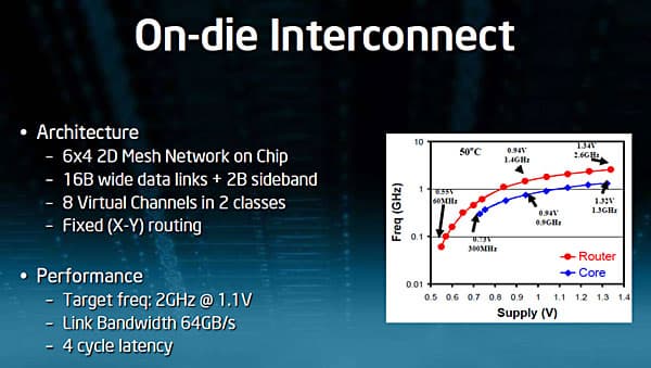 Итак, на одном чипе SCC объединено 24 двухъядерных процессора, по сути реализована архитектура кластера, когда много компьютеров объединены, например, через InfiniBand соединение. Отсюда и применение термина cloud (облако). Зато в случае объединения нескольких процессоров в одном чипе сразу устраняется проблема интерконнекта — все делается по внутренней шине и бесплатно в смысле топологии, задержек и прочего. Внутренний интерконенкт построен на основе архитектуры обмена сообщений, которая давно применяется в индустрии, с фиксированной длиной пути и частотой 2 ГГц.