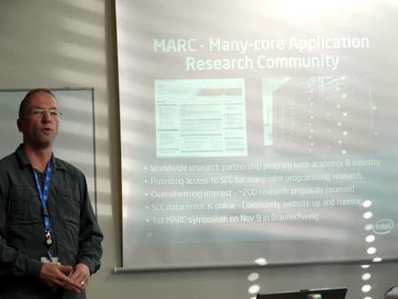 В Брайншвайге нам было показано, как работает SCC. На тестовых стендах используется специальная версии операционной системы SCC Linux, адаптированная под многоядерные системы. Сами SCC выполнены под стандартный процессорный разъем LGA 1567, применяемый для Xeon. На одном из ядер запускается сама ОС, а на других запускаются отдельные приложения или диспетчер отдает приложению нужное количество ядер. Впрочем, на каждом ядре можно запускать свою отдельную ОС. Неиспользуемые тайлы можно отключать.