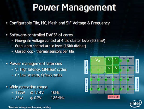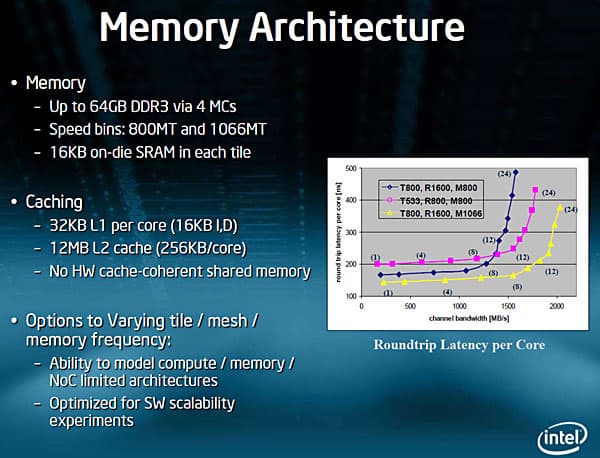 Для каждого тайла (тайл или блок состоит их двухъядерного процессора) можно индивидуально и динамически изменять тактовую частоту и напряжение. В SCC применяется четырехканальный контроллер памяти, по одному каналу на каждые 12 ядер. Каждый канал памяти поддерживает установку до 16 ГБ DDR3 (всего до 64 ГБ на SCC), при этом память работает на частоте 800 МГц. Если бы память работала на штатной частоте в 1600 МГц, то тогда каждый контроллер памяти мог бы обслуживать лишь восемь процессорных ядер при приемлемом уровне задержек (латентности).