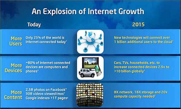 По сути облачные вычисления это результат естественной эволюции информационных технологий, главным положительным моментом от их применения является масштабируемость, в зависимости от потребностей потребителей. Тем не менее, пока не всё безоблачно в области облачных вычислений. Главный вопрос, волнующий потребителей — безопасность информации. Затем в списке идут энергопотребление, отсутствие единых стандартов, высокая стоимость владения и т. д. Корпорация Intel имеет богатый и успешный опыт в построении дата-центров с парадигмой облачных вычислений и решении вопросов, волнующих потребителей, на современном эффективном уровне. Всё это обеспечивается за счет внедрения серверных решений на базе архитектуры Xeon.
