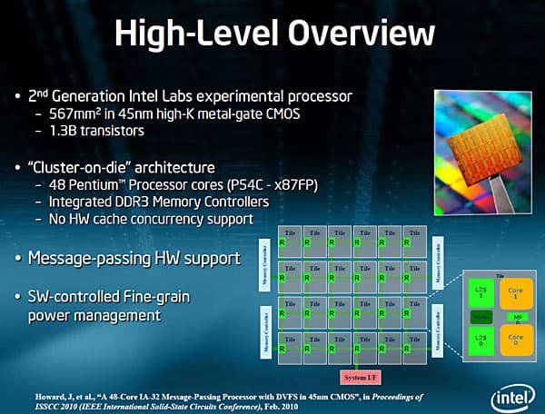 Работы в области many-core (многоядерных) решений в лаборатории Брайншвайга идут с 2006 года и в частности тут велись работы над Larrabee. Текущая разработка это уже второе поколение экспериментальных процессоров. SCC содержит 48 процессорных ядер, встроенный контроллер памяти DDR3 и аппаратную поддержку системы обмена сообщений. В качестве ядер в SCC используются старые добрые Pentium P54C. Выбор обусловлен исключительно простотой, доступностью и сбалансированностью данных CPU для поставленных задач. В кремнии SCC занимает площадь 567 кв. мм, содержит 1,3 миллиарда транзисторов и производится по 45 нм High-K CMOS технологическому процессу.