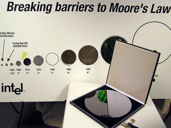 (Помню, я сам начинал работу на одном из крупнейших советских микроэлектронных предприятий с кремниевых пластин диаметром 3 дюйма, а двухдюймовые были тогда в ходу для арсенида галлия, так что «отстал» от того же Крейга Барретта я всего на пару этапов. ;))