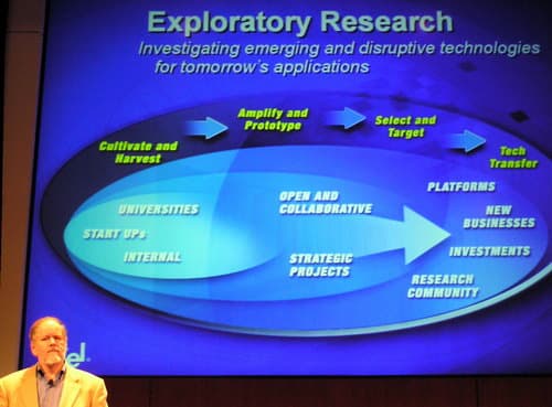 В отличие от широко разрекламированного Форума Intel для разработчиков (Intel Developer Forum, или просто IDF), популярного в определенных кругах IT индустрии порой не меньше, чем всемирные компьютерные выставки, так называемый ежегодный Intel Research Day известен общественности куда хуже (если не сказать — неизвестен вообще ;)). Попробуйте набрать в поисковых системах эти словосочетания, и скупость информации по данному мероприятию покажется вам чрезмерной. Едва ли не единственной адекватной ссылкой окажется страничка www.intel.com/research/events/intel_day/intel_day.htm на сайте самой корпорации с подробной информацией и презентациями с прошлогоднего Дня исследований в Intel. И это несмотря на то, что данное мероприятие прошло под патронажем и при непосредственном участии такого «компьютерного харизматика» как Патрик Гелсингер (Pat Gelsinger), возглавлявшего тогда в Intel соответствующие направления.