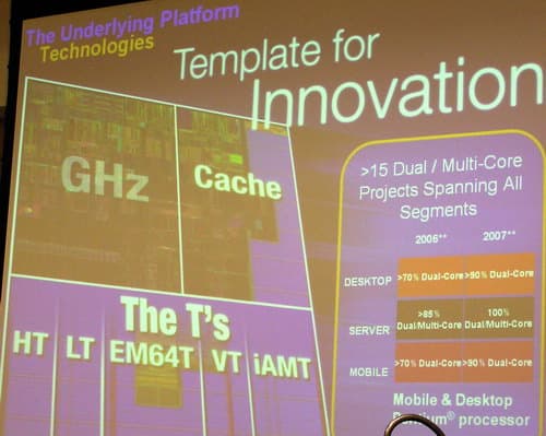 Индустрия сперва фокусировалась на производительности. Теперь же в фокусе «usage oriented сomputing» (вычисления, ориентированные на пользователя) и соотношение цена+возможности на ватт (Price/Capability per Watt), а не price/performance/watt. Двадцать лет инноваций в полупроводниковой промышленности и технологии прошло — теперь наступают 20 лет поиска, куда огромные наработки можно было бы применить, сделать технику более управляемой (manageability). Причем уже до 5 миллиардов долларов тратится на безопасность IT-систем — это половина всех затрат в данном сегменте. Отметив, что рынок процессоров Intanium сейчас — наиболее быстрорастущий среди серверных (Sun недавно перешла на использование этих процессоров Intel, а остальные 8 крупнейших производителей серверов, включая Fujitsu-Siemens, перешли еще раньше), «генералы» Enterprise-направлений Intel подчеркнули, что с 1996 года было поставлено более 30 миллионов серверов на процессорах Intel. А в родмэпе enterprise-систем и платформ корпорации появились теперь и системы на Pentium 4 и Pentium D — с чипсетом E7221 и будущими для двуядерных процессоров! «Дорожная карта» (как теперь модно выражаться) на двухъядерные процессоры Intel утверждает, что в 2006 году 70% проданных настольных и мобильных процессоров и 85% серверных процессоров будут двухъядерными, а в 2007 году таковыми станут 100% серверных и 90% потребительских процессоров этой корпорации!