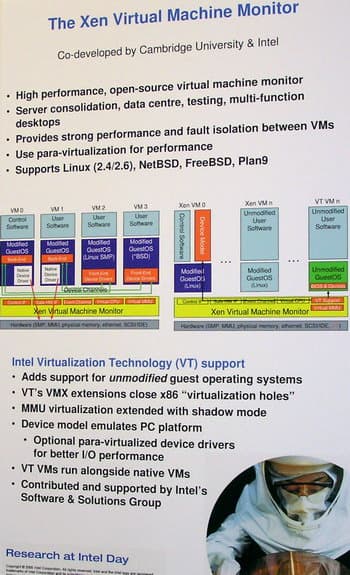 Виртуальная машина Xen (Зен) умеет работать на процессорах Intel с поддержкой Vanderpool Technology (VT) и в данном случае демонстрировалась на Linux-системе.