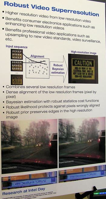 Со стороны это выглядит почти так, как показывают в полуфантастических голливудских блокбастерах — берется крайне «замыленная» и «запикселенная» картинка и из нее «кадрируется» нужный фрагмент с «запредельным» улучшением четкости. :) Причем делается это в реальном времени (даже для видео). Для этого применяются специальные подходы с использованием байесова преобразования.