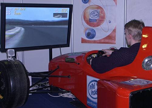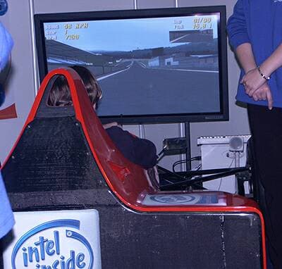 Виденная мною ранее в метро реклама предлагала посетить на выставке стенд компании Intel c симулятором формулы один, на котором, в ходе виртуального чемпионата по автогонкам, разыгрывался компьютер на базе процессора Pentium 4 2 ГГц. Собственно, судя по наличию единственной на этой выставке очереди (вру, вторая была в кафе), да и по возрасту посетителей, половина оных пришла на ИНВЕКОМ для того, чтобы навернуть круг-другой. Наконец, и я втиснулся в эту (как бы точнее выразится) «полумашину»: