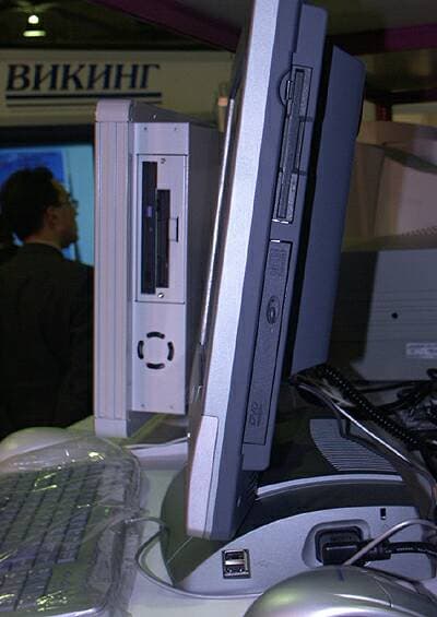 Впрочем, вернемся к нашим баранам, точнее компьютерам. Неожиданно я встретил примечательный и ранее не виденный мною barebone с ЖК-экраном, рассчитаный на стандартную microATX плату! В комплекте идет ЖК, блок питания и флоповод — остальное пользователь установит сам: