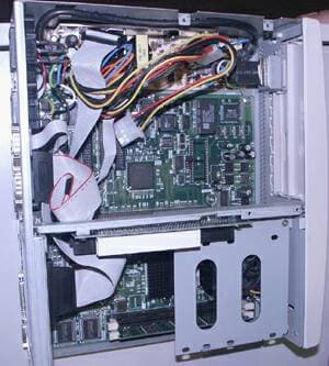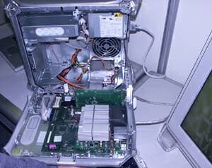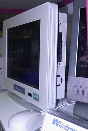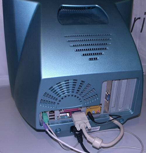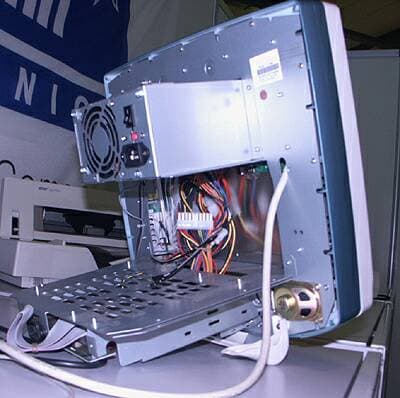 сзади. Очень похоже по компоновке на iMac. Однако, наличие ЖК позволяет не только порадовать глаз и медиков, но и поместить в этом корпусе четыре карты расширения, полноценную microATX материнскую плату, а также CD (/R/RW/DVD) привод и винчестер. Совершенно стандартные, недорогие, производительные и что самое главное на свой вкус. Экономия места очевидна — терминатор с монитором замет ничуть не меньше этого моноблока.