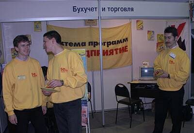1С, запомнившаяся всем огромными желтыми пятнами своих стендов на КОМТЕК-е, в Санкт-Петербурге была представлена более чем скромно: