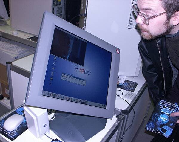 На радость Линуксоидов и Сисадминов (тех что помоложе и без претензий) на выставке продавался ASP Linux, в разных вариантах, включая и прекрасный подарочно-коробочный. Там был и StarOfffice и даже игры вчерашнего дня (Hexen и т. д.). На одном из стендов посетители удивленно наблюдали процесс проигрывания DIVX фильма под Linux-ом. Впрочем, может быть, людей привлекал не факт сдачи windows очередного бастиона, а повернутый под углом 30 градусов монитор (такую икебану мы уже видели на выставке КОМТЕК, на стенде ViewSoniq, если не ошибаюсь…):