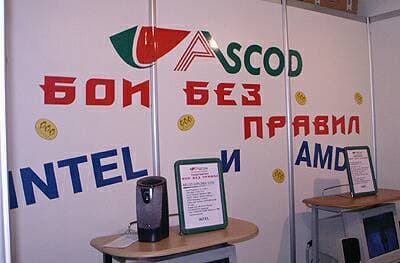 Ага, что то интересное. Ребята из фирмы ASCOD свели лицом к лицу Intel P4 1700 и Athlon XP 1700+. Отлично. Только почему на первом 128 MБ RDRAM а на втором 256 DDR? Как выяснилось — это всего лишь опечатка, и там и там в наличии по 256 МБ памяти. Немного работы маркером… и, теперь, условия равны. Другая странность: на обеих машинах установлен слабенький MX400 и различные тесты в большинстве своем занимались сравнением двух одинаково неторопливых карт. Но, к счастью, на второй день выставки (благодаря немалому числу просьб со стороны сознательных посетителей), ситуация была исправлена — и в обе конфигурации включены полноценные карты на базе GeForce3 от ABIT. Надеюсь, что на следующей выставке (если она будет) подобной «работы над ошибками» делать не придется.