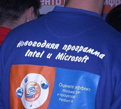 Да, именно «полу» — т. к. задняя часть была отрезана за очевидной ненадобностью. Роль пламенного мотора играл на сей раз обычный ПК на базе процессора … — совершенно верно! Судя по многочисленным надписям на корпусе гоночной полумашины, еще один процессор лежал у нее где-то внутри. Как выяснилось позже, кроме группы молодых людей в примечательных футбоках национальных интеловских цветов, демонстировавшей различные «наглядные гудисы» от Intel (знакомые нам по последнему КОМТЕК-у демо программы), на стенде никого небыло. Направляясь на выстаку я предпологал пообщаться с московскими работниками Интел Текнолоджис ИНК, но, достигнув цели, понял, что они не появились здесь совершенно справедливо.