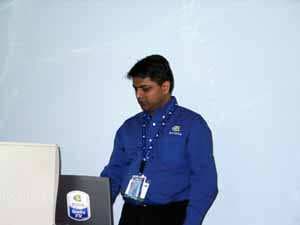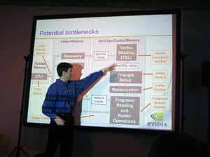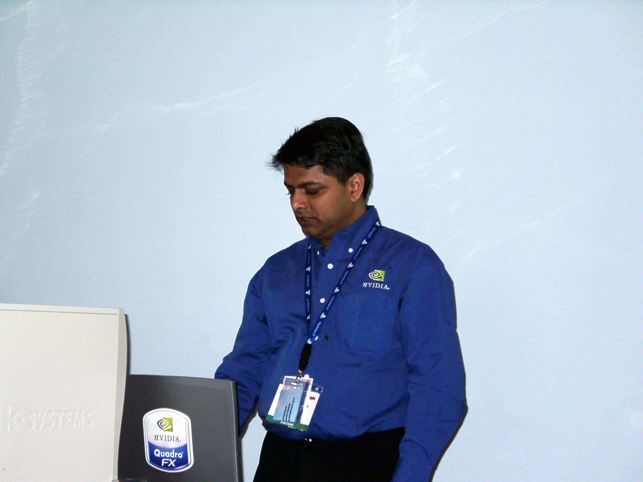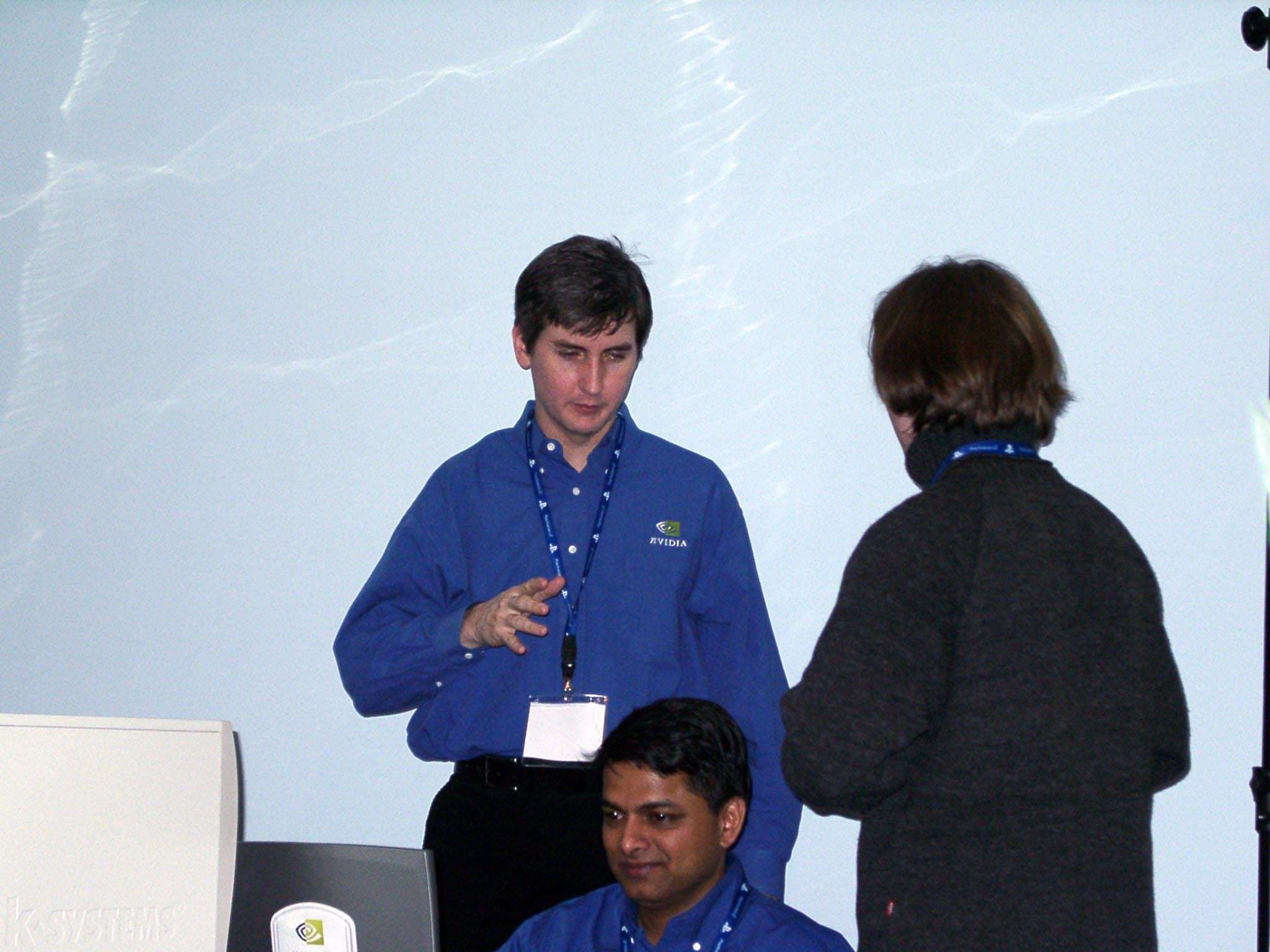 Компания NVIDIA была представлена двумя лекторами: Джоном Спитцером (John Spitzer) и Ашу Рейджем (Ashu Rage) (на снимке ниже: Спитцер слева, Ашу — внизу, справа Филипп Герасимов с вопросом :)