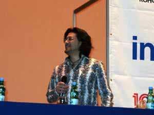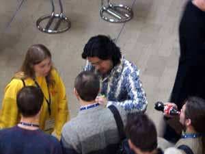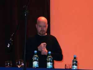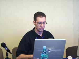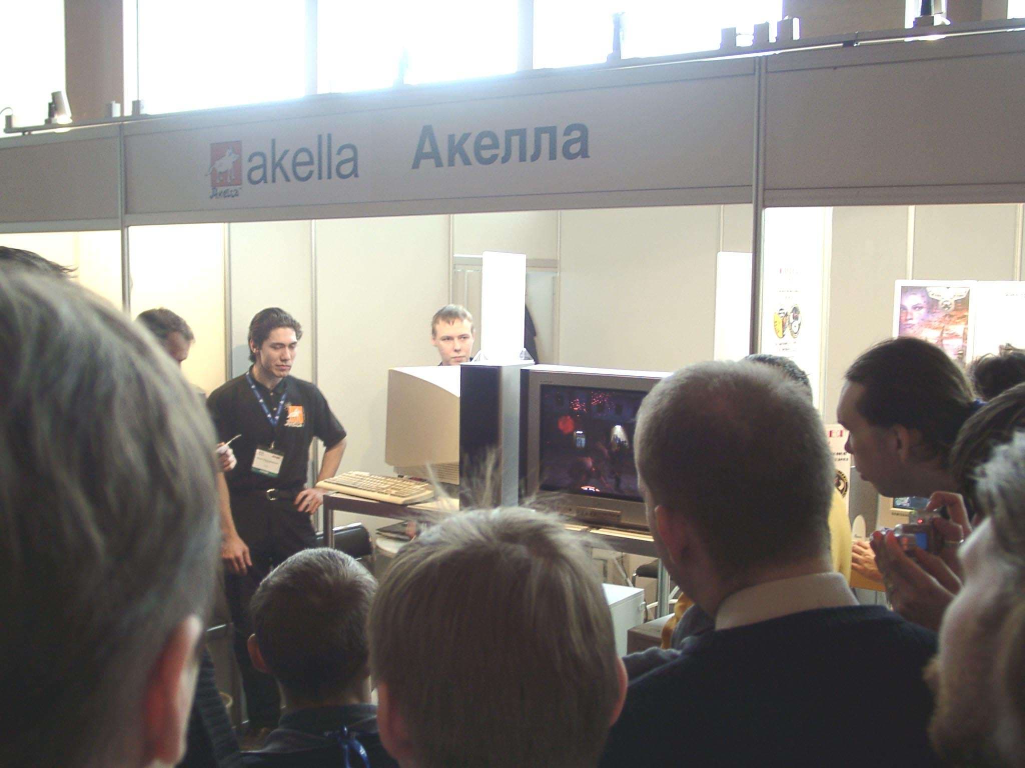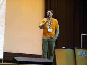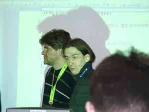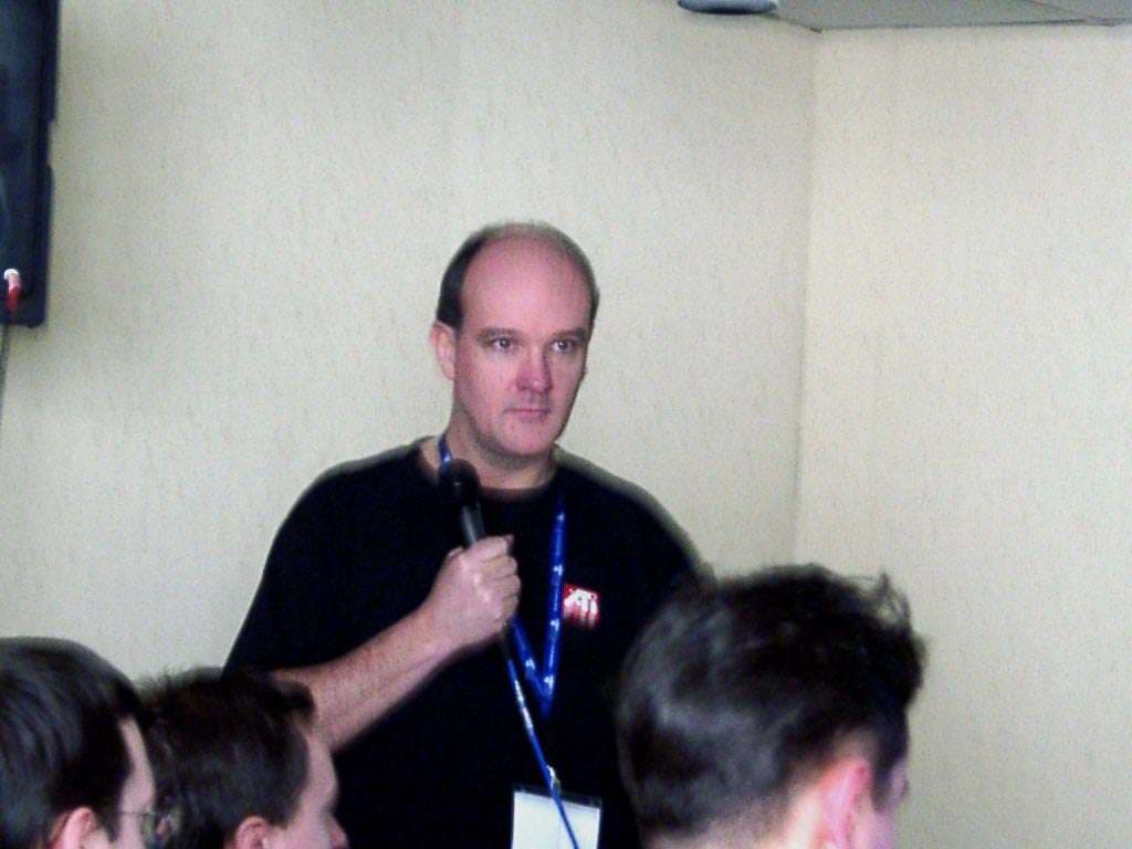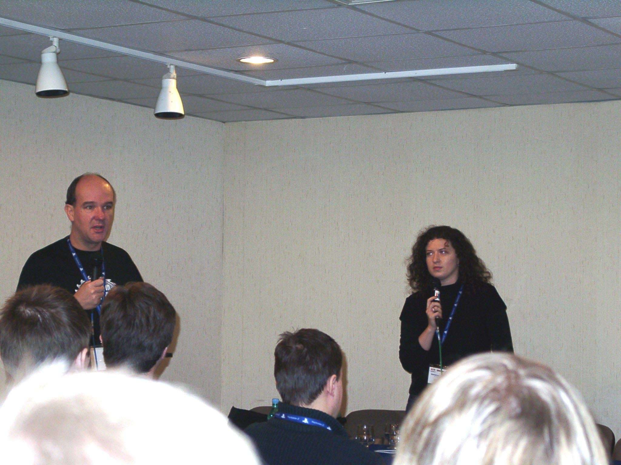 Затем по очереди выступили представители Оггкомитета Конференции (Александр Федоров), спонсоров мероприятия, в частности компаний Intel (Дмитрий Ильин, речь была посвящена более активному использованию новых технологий Intel, прежде всего HyperThreading в играх) и ATI (Геннадий Ригер). Завершилась церемония выступлением звездной, так сказать, пары: Тома Холла (Tom Hall) и Джона Ромеро (John Romero, ex-id Soft, ex-ION Storm) из компании Midway Entertainment.