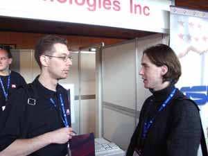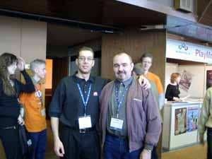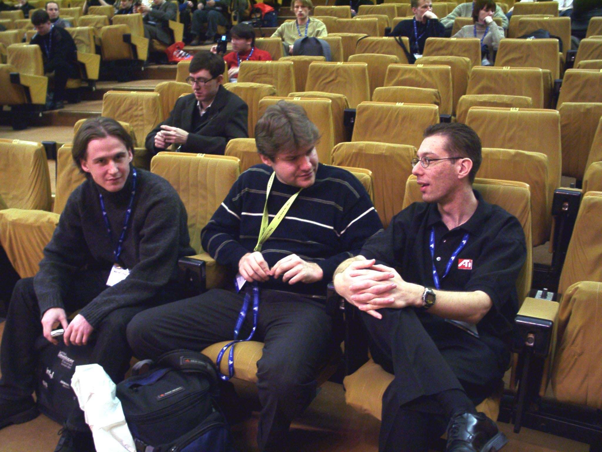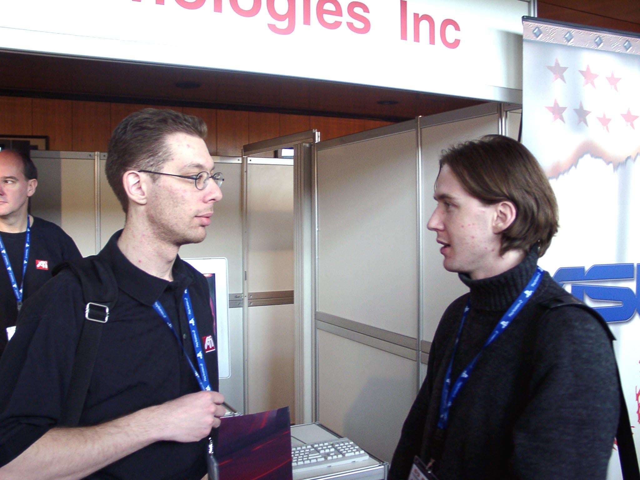 По завершении семинаров NVIDIA я вернулся на цикл лекций ATI. А до этого был перерыв с весьма неплохим обедом (спасибо организаторам!) и беседами около стендов. В частности, пообщались неплохо с Геннадием Ригером из ATI (на левом снимке Гена и Филипп Герасимов, на правом Гена и Андрей Воробьев):