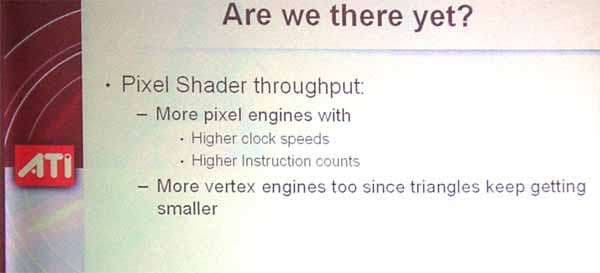 Итак, текущая ситуация описана, куда же двинется ATI далее? Несомненно современным и будущим играм все также будет необходим запас по скорости заполнения сцены, при этом сложность шейдеров будет увеличиваться. Поэтому количество пиксельных конвейеров будет расти с одновременным увеличением частот и уменьшением ограничений по размеру шейдеров. Количество вершинных конвейеров также вырастет из-за постоянного уменьшения среднего размера треугольников и, соответственно, увеличения количества треугольников в кадре.