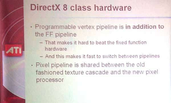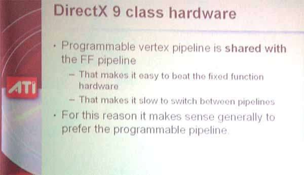 На вышепредставленных двух слайдах Ричард уделил внимание различиям в реализации модуля, отвечающего за TCL в R2xx и R3xx. Если в поколении RADEON 8500-9100 блок вершинных шейдеров и блок с фиксированным TCL это действительно были два различных блока, то начиная с RADEON 9500 и выше фиксированный TCL эмулируется шейдером. Поэтому на R3xx всегда выгоднее использовать вершинные шейдеры, оптимизированные для конкретных нужд.