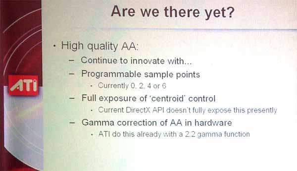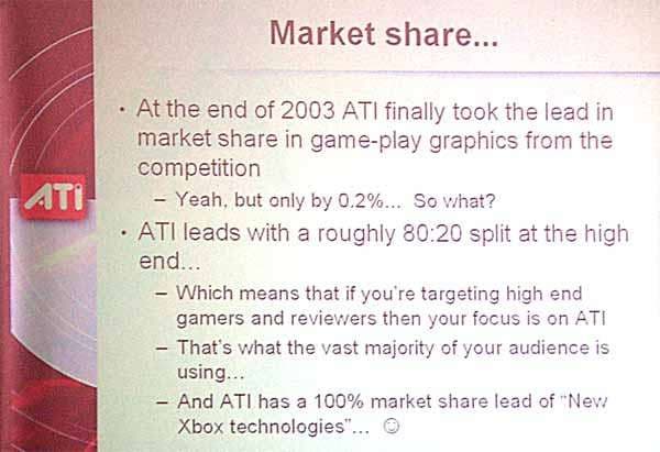 Ни одной лекции без евангелизма! Ричард не забыл упомянуть достижениях ATI: впервые за долгое время рыночная доля ATI превысила оную у NVIDIA. И хотя цифра в 0,2% может выглядеть неубедительно — главное что она показывает, то что ATI уже давно не второстепенный игрок. Сейчас у ATI наблюдается явное лидерсво в High-End, а с приходом XBox Next большинство разработчиков будут использовать в первую очередь именно возможности ATI.