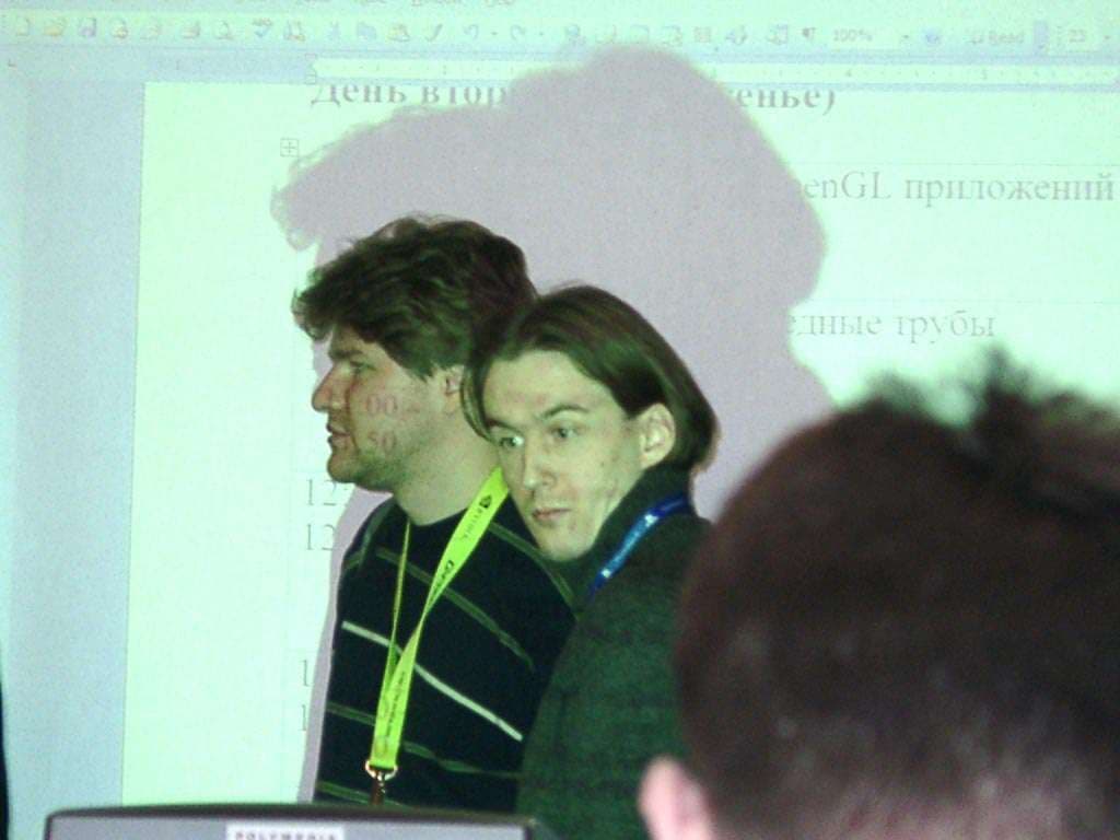 В этот день у сотрудников ATI был еще более напряженный день, ибо было много лекций и семинаров. Интересно попали в кадр Александр Медведев и Филипп Герасимов, встав на пути света от проектора:
