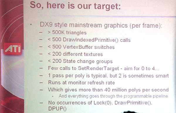 Этот слайд показывает рекомендации по количеству вызовов DirectX API, в границах которых возможно оптимальное использовании видеокарт на последнем поколении чипов (RADEON 9500-9800). Хотя слайд и относится к презентации ATI, точно такие же рекомендации по использованию API дает и NVIDIA.