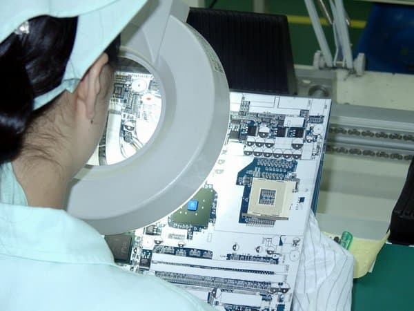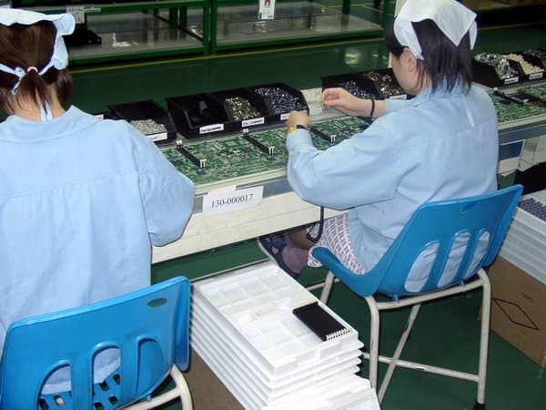Две девушки, работающие параллельно, накладывают на очередную принесенную конвейерной лентой плату специальный трафарет и проверяют, все ли требуемые элементы смонтированы на поверхности.