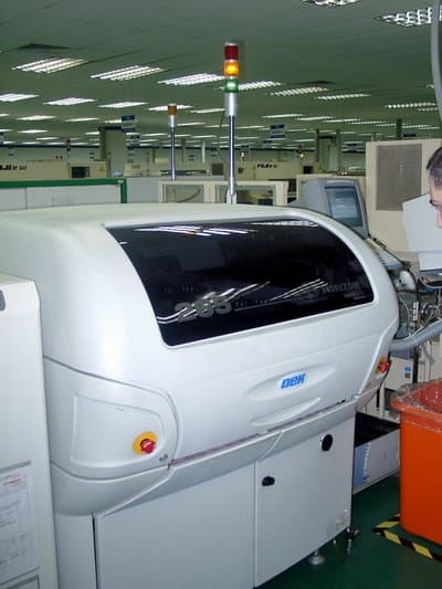 Начинается конвейер (а их на фабрике четыре, с суммарной мощностью до полумиллиона изделий в месяц) с обработки «свежевыпеченных» печатных плат. Те, конечно, не из воздуха берутся, но установка по производству PCB (современные технологии и оборудование компании позволяют печатать платы до 18 слоев толщиной) в кадр не попала.