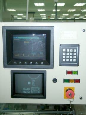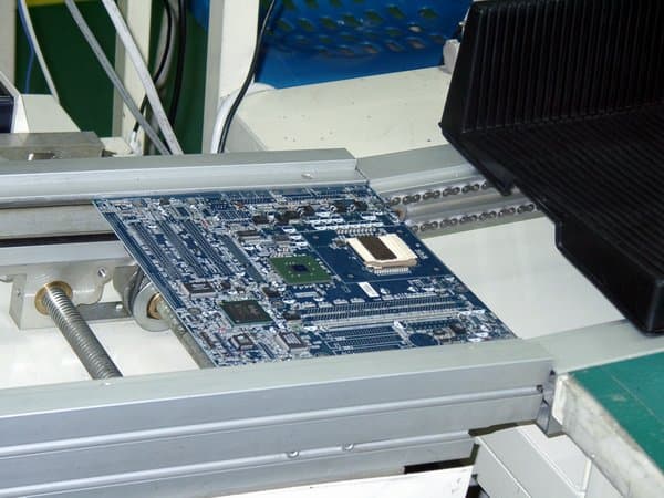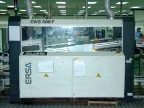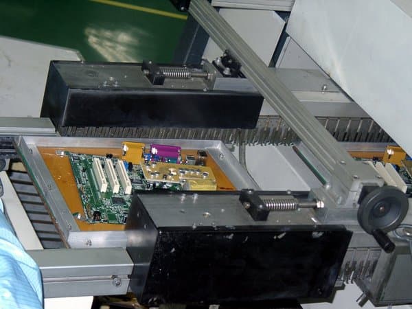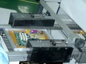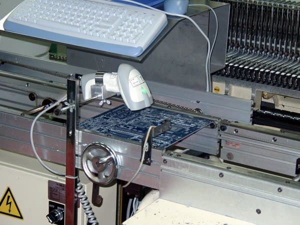 При выходе из устройства заготовка попадает на собственно конвейерную линию, где проходит стадию сканирования: в общую информационную систему предприятия заносятся данные о серийном номере платы, которые впоследствии используются для отслеживания качества продукции, статистического учета и т. п.