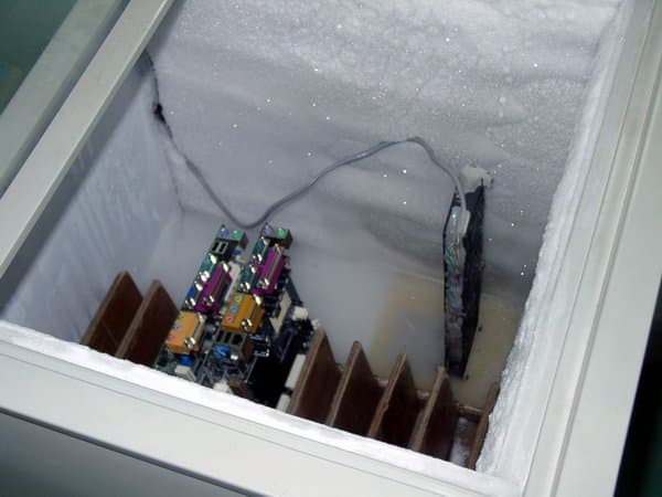 А вот эта милая девушка отнюдь не играется потихоньку в рабочее время, и даже не ставит рекорды в оверклокинге, а гоняет тест (старый добрый 3DMark), проверяя работоспособность продукции QDI в условиях низких температур.