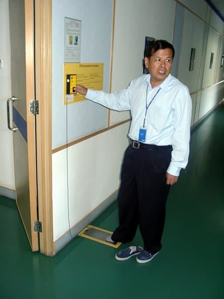 А вот о функционировании линии по сборке материнских плат, думаю, имеет смысл рассказать поподробнее. (Хочу порекомендовать тем, кто по какой-либо причине не читал ранее, ознакомиться с материалом «Производство системных плат в фирме "Формоза"» — можно до, можно после. Будет интересно сравнить.) Перед входом в помещение с производственным конвейером все работники проходят проверку на электробезопасность (журналисты, поклявшиеся ни до чего не дотрагиваться, ограничились антистатическими бахилами на ногах).