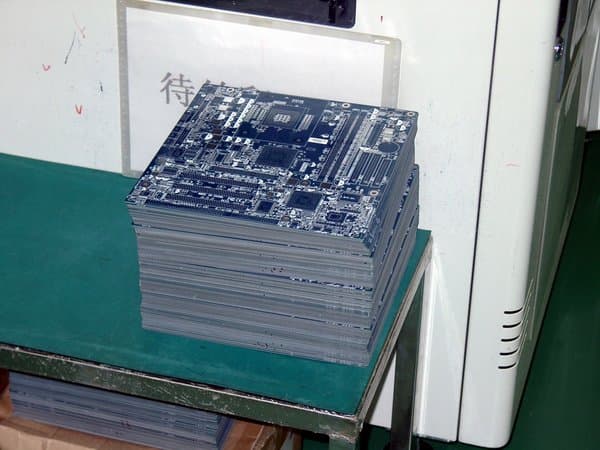 Стопка плат помещается в устройство для нанесения на поверхность по шаблону специальной пасты (для последующей припайки набортных элементов).