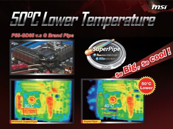 Следующая технология, предназначенная для более эффективного охлаждения системной платы, называется SuperPipe. Это тепловая трубка толщиной целых 8 мм, что, согласно презентации, является беспрецедентным среди теплоотводов материнских плат. Для доказательства эффективности работы новой технологии были представлены две теплограммы системных плат MSI: с установленной трубкой SuperPipe и без неё: