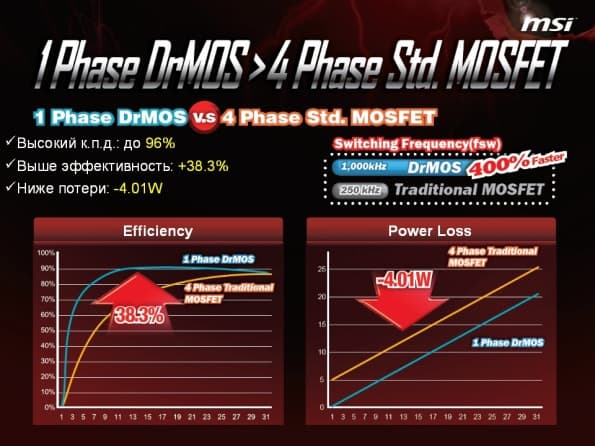 Что касается электропитания, то здесь применена уже использованная в платах серии P45 технология DrMOS. Она предназначена для увеличения КПД системной платы и уменьшения потерь электроэнергии. В одном компактном корпусе DrMOS находится управляющая микросхема и пара транзисторов MOSFET. Такое расположение позволяет на 400% увеличить скорость переключения по сравнению с обычными транзисторами. Помимо этого сравнения, в презентации были также приведены соответствующие показатели эффективности и потерь электроэнергии: