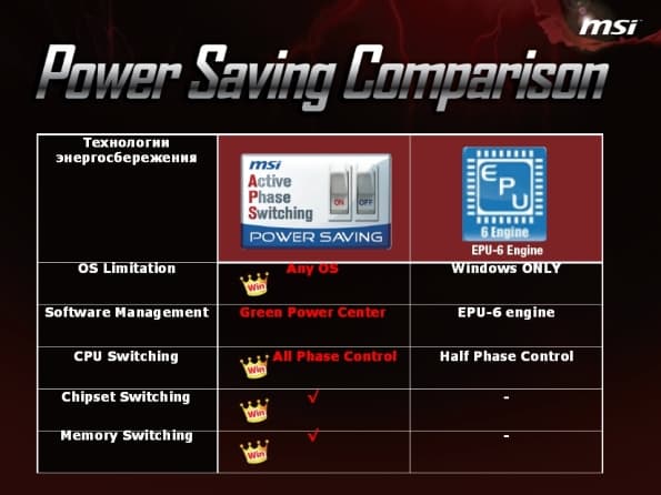 В новой серии материнских плат MSI использована также технология APS (Active Phase Switching), зарекомендовавшая себя еще в двух предыдущих сериях. Суть её в том, что, в зависимости от загрузки элементов системы, фазы питания для них могут отключаться и включаться, что приводит к экономии электроэнергии. Более того, в материнской плате P55-GD65 предусмотрены светодиодные индикаторы состояния фаз, а в модели P55-GD80 — еще и счетчик их текущего количества. После рассказа о самой технологии было проведено сравнение с аналогом: