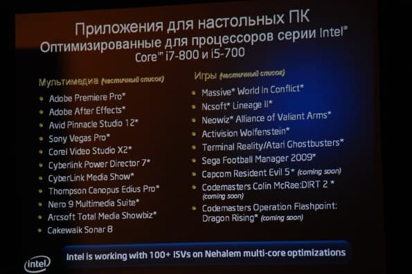 В заключение представительница компании Intel привела список приложений, оптимизированных для процессоров Intel Core i7-800 и i5-700: