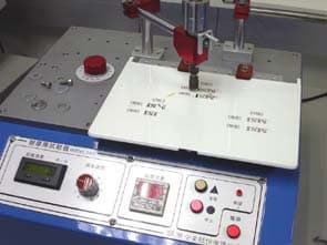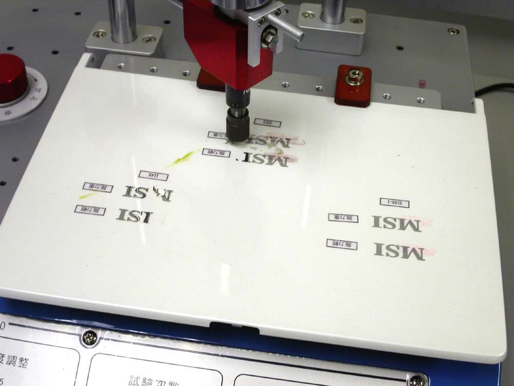 Если после этого портативный компьютер всё еще проявляет признаки жизни, его переносят на следующую «пыталку». Целью этого эксперимента является исследование прочности крышки ноутбука при незначительных внешних воздействиях, а также выявление устойчивости наклеек и надписей, нанесенных на неё. Фирменные логотипы и эмблемы не должны быстро потускнеть, ободраться и потерять товарный вид.